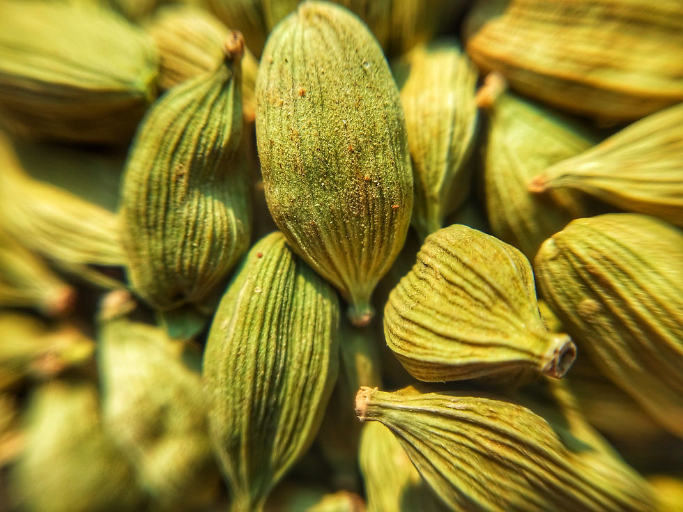 Cardamom, also known as the "Queen of Spices", is a highly aromatic spice derived from the seeds. The cardamom pod, which contains hard, black seeds, is sometimes added whole to dishes. More commonly, the pods are opened and the seeds are removed, then roasted in an oven or a skillet. These seeds contain the spice’s essential oil, which gives it its flavor and scent, with hints of mint and lemon. Introduced to Europe in the mid-16th century, cardamom bears a name that blends the Greek words for “spice” and “cress.”It's known for its distinctive flavor and aroma, making it a popular ingredient in both sweet and savory dishes worldwide. Cardamom is also recognized for its potential health benefits, including aiding digestion, controlling blood pressure, and freshening breath. Cardamom contains vitamin C, niacin, magnesium, and potassium. Apart from its distinctive flavor, cardamom contains high levels of antioxidants, and it is used in Ayurvedic medicine to treat urinary tract disorders and to lower blood sugar levels.